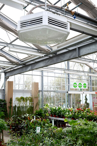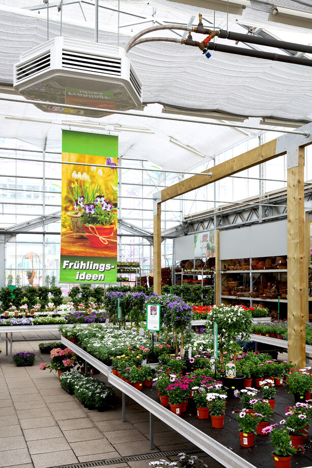 Ein Dutzend Lufterhitzer Ultra wurden im Garten-Center für die rundum verglasten Verkaufsflächen nachgerüstet. "Der leistungsstarke Ultra schafft auch bei großflächigen Verkaufsräumen ein zuverlässiges Wohlfühlklima für die Kunden"