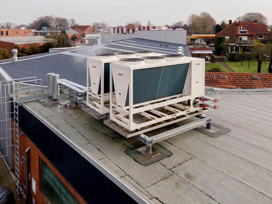 Vue du ciel à proximité, la grande installation photovoltaïque qui recouvre presque tout le toit du concessionnaire est inévitable. En revanche, les deux générateurs d'eau froide de type KaClima AO, qui se trouvent également sur le toit, paraissent presque petits. Il est vrai que le KaClima AO se caractérise par sa petite taille, mais sans renier sur la performance ni le confort. L'appareil, qui doit être installé à l'extérieur, fonctionne à des températures extérieures basses par free cooling et permet ainsi d'économiser une grande quantité d'énergie. Le montage en cascade du KaClima AO est également une solution cohérente. En outre, des kits de tuyauterie préfabriqués facilitent le montage. L'appareil atteint sa puissance de 1360 kW maximum grâce à l'utilisation du réfrigérant d'avenir R32, ce qui permet de réduire l'équivalent CO₂ jusqu'à 75 %.
