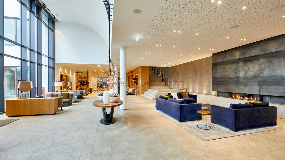 Le nom de « Galeria », qui comprend également la réception, n’a pas été choisi au hasard : une façade vitrée de près de sept mètres de haut offre une vue sur le château de Hohenschwangau situé en face. Pour protéger la pièce contre les infiltrations d’air froid, des Katherm QK sont installés devant la façade. Le convecteur de sol est équipé d’un ventilateur tangentiel EC particulièrement silencieux et d’un convecteur en cuivre-aluminium très puissant. Le Katherm QK peut être modifié selon les besoins : coins en onglet, versions coudées, évidements de colonnes, biseaux - toutes les géométries sont possibles.