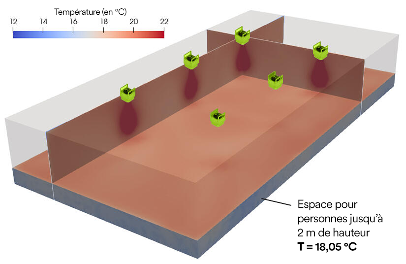 La simulation de l’exemple de bâtiment montre que : même avec une température extérieure de -12 °C, les aérothermes à basse température atteignent une température supérieure à 18 °C dans le bâtiment.