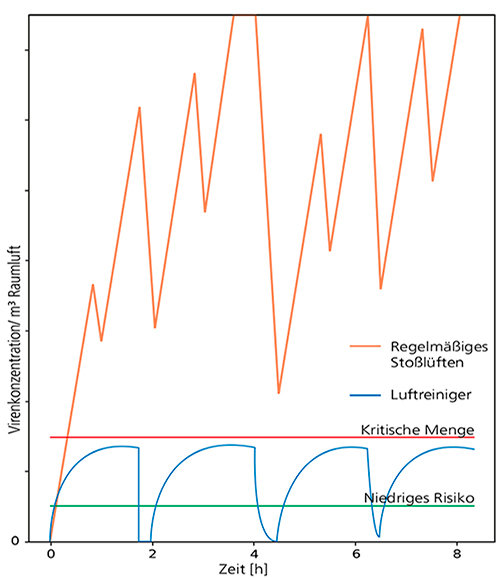 Grundlage der Berechnung ist die Menge an Viren, die eine infizierte Person über einen Zeitraum von acht Stunden an die Raumluft abgeben würde. Durch eine regelmäßige Stoßlüftung per Fenster kann die Virenkonzentration nicht ausreichend verringert werden. Selbst die lange Stoßlüftung während der Mittagspause reicht hier nicht aus.