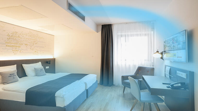 Die Standardlösung für die Zimmerklimatisierung ist ein Fan Coil – also ein Gerät das per Wärmetauscher erwärmte oder gekühlte Luft mit Hilfe eines Ventilators in den Raum gibt. Kampmann setzt hier konsequent auf den Einsatz von Ventilatoren mit der sogenannten EC-Technologie. Im Vergleich zur herkömmlichen und noch verbreiteten AC-Technologie verbraucht der Kampmann Fan Coil Venkon nur ein Fünftel der Energie. Und verhindert so auch den Ausstoß großer Mengen CO2. Zudem kühlen die Fan Coils die Zimmer mit moderaten Vorlauftemperaturen und heizen im sparsamen Niedertemperaturbereich. Optimalerweise in Kombination mit einer Wärmepumpe, die sowohl warmes als auch kaltes Wasser zur Klimatisierung liefert.