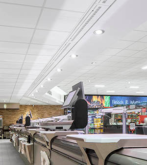 Im Fall von Lebensmittelmärkten bringen Frischetheken wiederum besondere Anforderungen mit sich. Hier gilt es, mittels Überdruck hinter der Theke, den Eintrag von Schadstoffen aus dem Kundenbereich zu verhindern. Gleichzeitig muss aber der Klimakomfort für das Personal hoch sein, da ansonsten die Lüftungsanlage gedrosselt oder schlimmstenfalls ausgeschaltet würde. Kampmann löst diese Problematik mit Hilfe einer Kombination aus Schlitzauslässen und Drallauslässen. Dabei wird ein gerichteter Luftschleier zur Abschirmung nach vorne mit hochinduktiven und behaglichen Drallauslässen kombiniert. Letztere erzeugen das Überdruckgebiet hinter der Theke, das wiederum für eine Verdrängungswirkung zum Markt hin sorgt. Falls der Platz beschränkt ist, können auch beide Mechanismen in einem Gerät realisiert werden. Der Kampmann KaProtect ist solch ein Kombigerät.