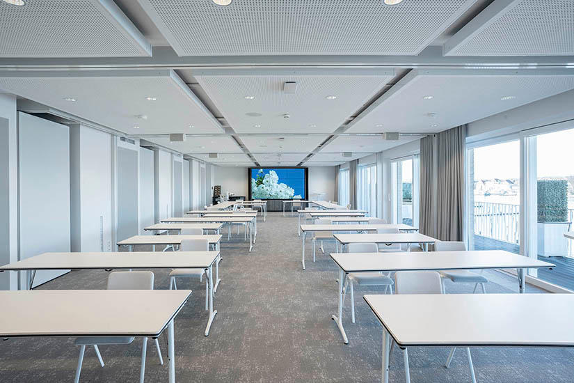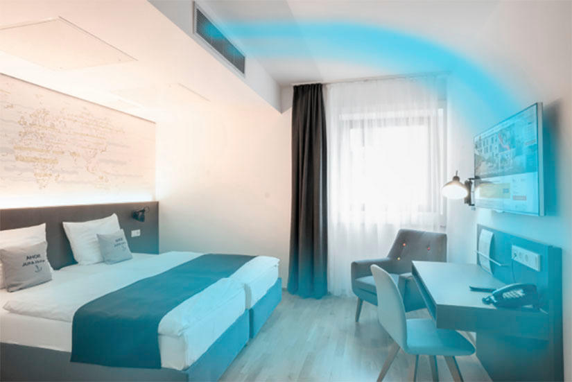 In Aufenthaltsbereichen wie Lobby und Frühstücksraum können beispielsweise Deckenkassetten eingesetzt werden. Sie arbeiten flüsterleise mit EC-Ventilatoren und bringen die Luft besonders behaglich in den Raum ein. In den Tagungsräumen bietet sich ein Kühldeckensystem an, dass für ein angenehmes Klima sorgt. Selbst bei hohen Außentemperaturen spürt der Gast nichts. Das Kühlsystem verbirgt sich hinter einer gelochten Gipskartondecke und arbeitet absolut geräuschlos und zugfrei. Zudem gewährt die Decke eine zusätzliche Schallabsorption.
