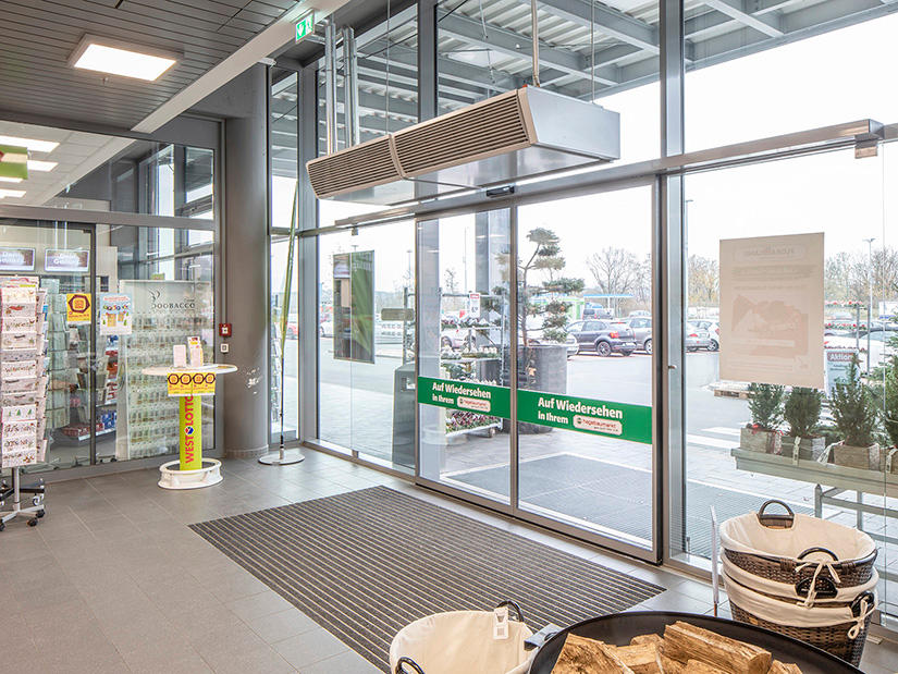 Installierte Türluftschleier an den Eingängen schützen den Verbrauchermarkt vor Kaltlufteinfall.