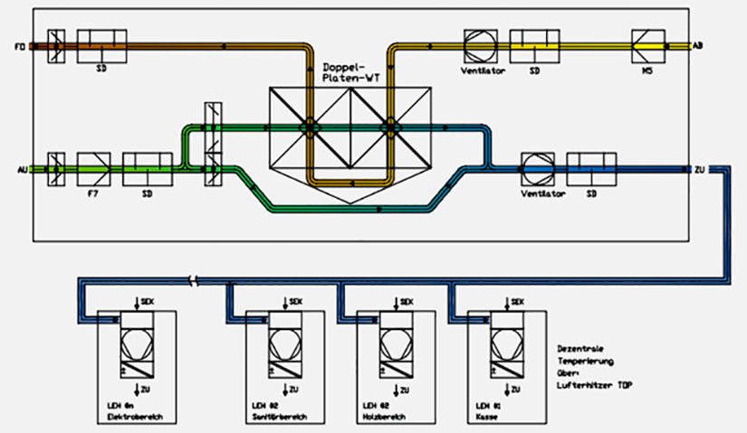Eine zentrale Lüftungsanlage sorgt für den hygienischen Mindestluftwechsel im Markt oder in der Verkaufsfläche. Sämtliche Heiz- und Kühlasten werden dann über dezentrale Geräte eingebracht. Dieses Prinzip bezeichnen wir hybrides System. Es bietet ein hohes Einsparpotenzial durch bedarfsgerechte Klimatisierung. Außerdem können die Nutzer die jeweiligen Bereiche individuell und autark vom RLT-Gerät temperieren. Dafür werden beispielsweise Lufterhitzer eingesetzt.