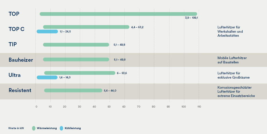 Für jedes Projekt kann eine individuell passende Lösung gefunden werden, die alle objektspezifischen Anforderungen optimal erfüllt, ob Heizen und/oder Kühlen, ob in Industrie und Gewerbe oder Verkaufsraum usw. Die Lufterhitzer-Reihe mit EC-Technologie deckt eben einen außerordentlich großen Leistungsbereich ab.