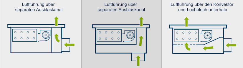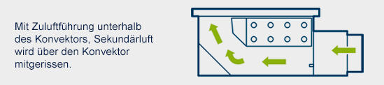 Beim Katherm QK sorgt das aufeinander abgestimmte Zusammenspiel aus laufruhigem EC-Querstromventilator und Hochleistungs-Kupfer-Aluminium-Konvektor für ein optimales Raumklima. Über verschiedene Wege kann hier die Zuluft in den Raum gebracht werden. Nachfolgend zwei Beispiele für eine Luftführung mit separtem Ausblaskanal sowie einem Beispiel für die Primärluftdurchströmung durch den Konvektor.