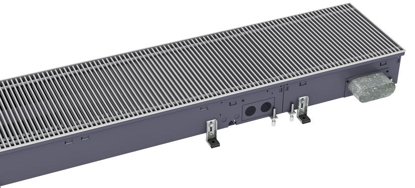 Bei den Katherm NK Unterflurkonvektoren, die nach dem Prinzip der natürlichen Konvektion funktionieren, können die Zuluftanschlüsse seitlich oder von unten an den Kanal angebracht werden. Die Anschlüsse führen zu einer zusätzlichen Leistungssteigerung.