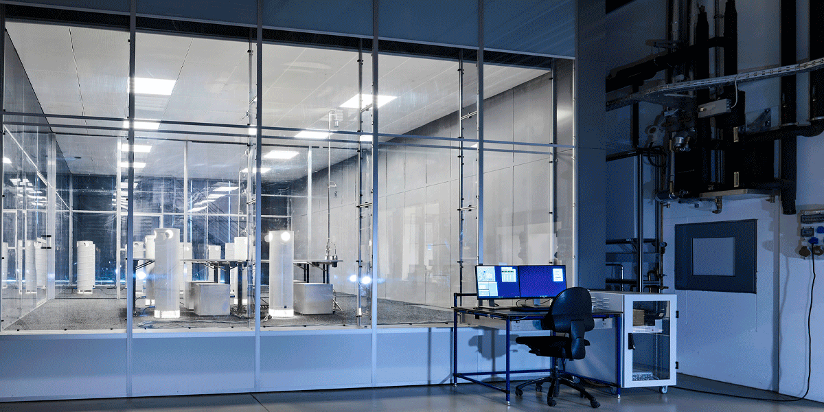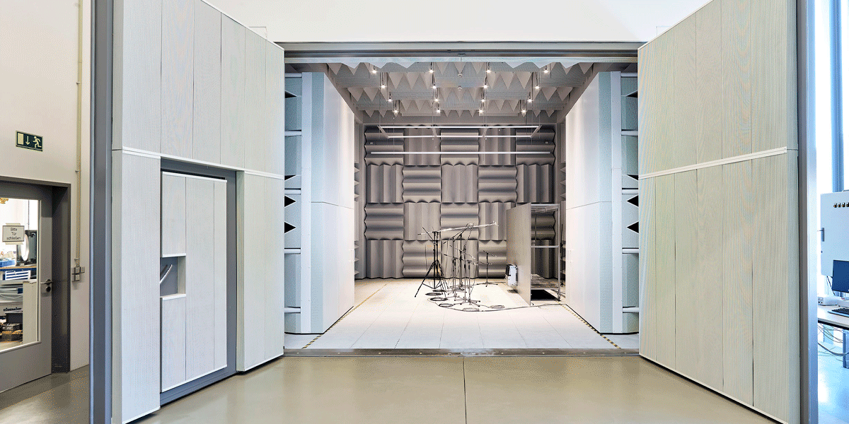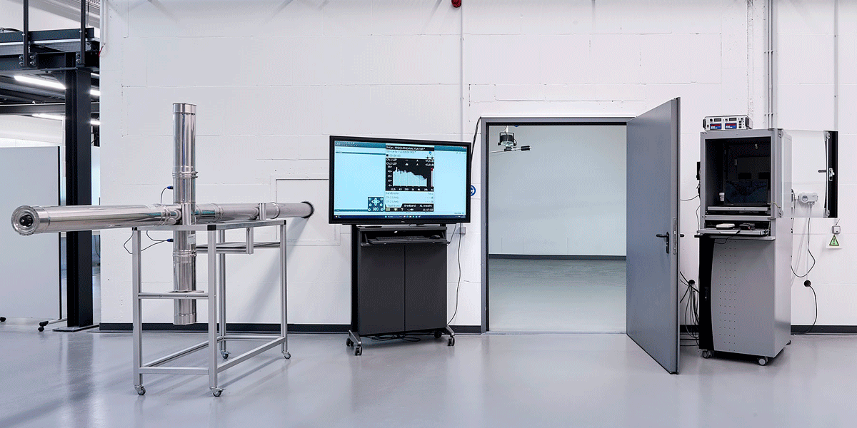 So beeindruckend das Betreten des schalltoten Schallmesslabors mit seiner nahezu beklemmenden Stille ist, so gegensätzlich ist der Aufenthalt im Hallraum: An den schallharten Wandflächen, keine davon parallel zur Gegenüberliegenden, werden Schallwellen ständig reflektiert. Hierdurch entsteht ein starker Nachhall, sodass ein gleichmäßiges, diffuses Schallfeld entsteht, optimal zur Bestimmung der Schallleistung von Fan Coils und anderen Produkten. Die im Hallraum integrierte Trennwand separiert den Prüfstand in einen Sende- und einen Empfangsraum. Die hier möglichen Bauakustikmessungen ergänzen das Portfolio der Möglichkeiten im Bereich Akustikmessung optimal.