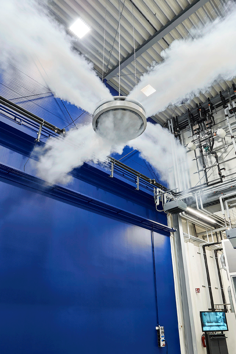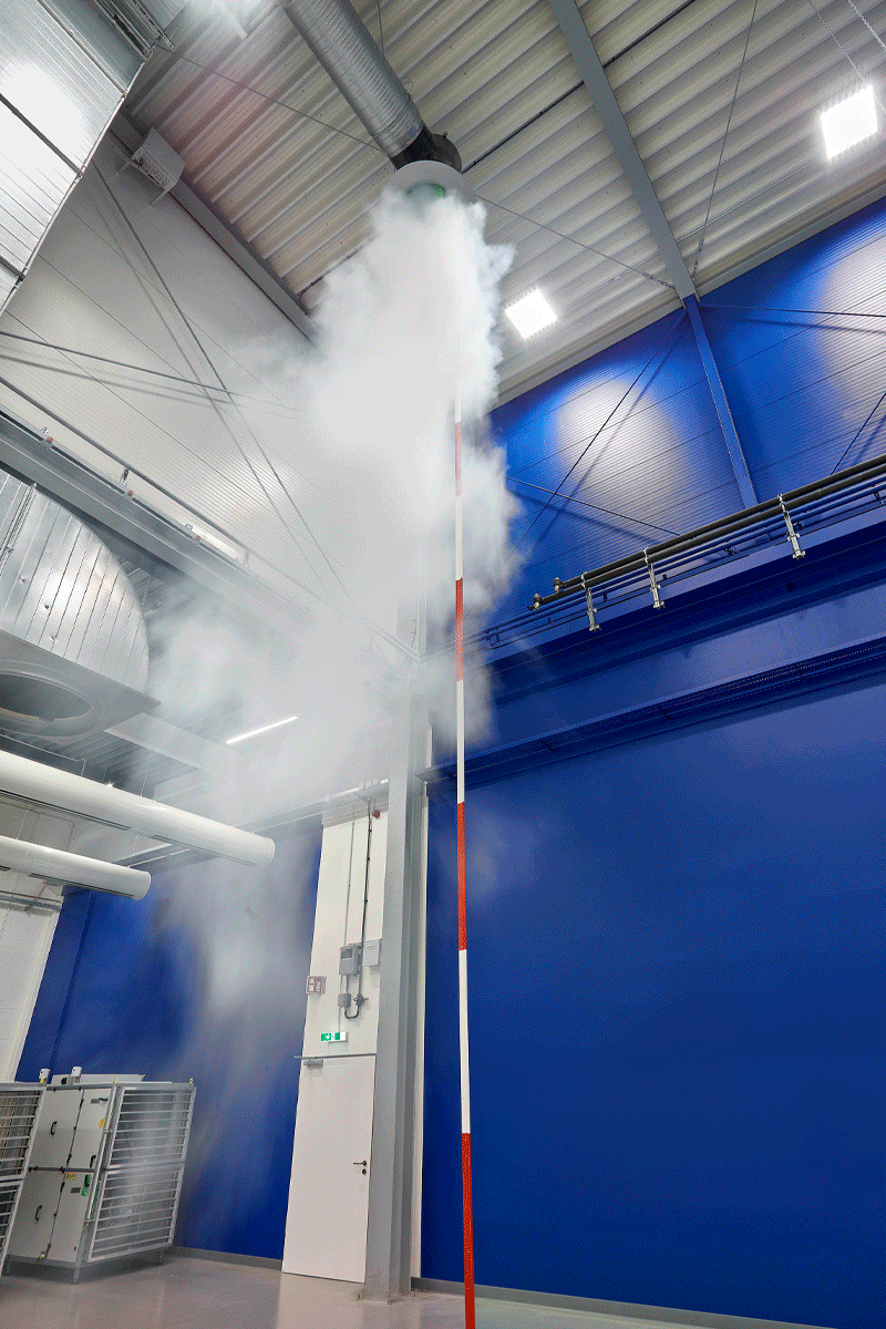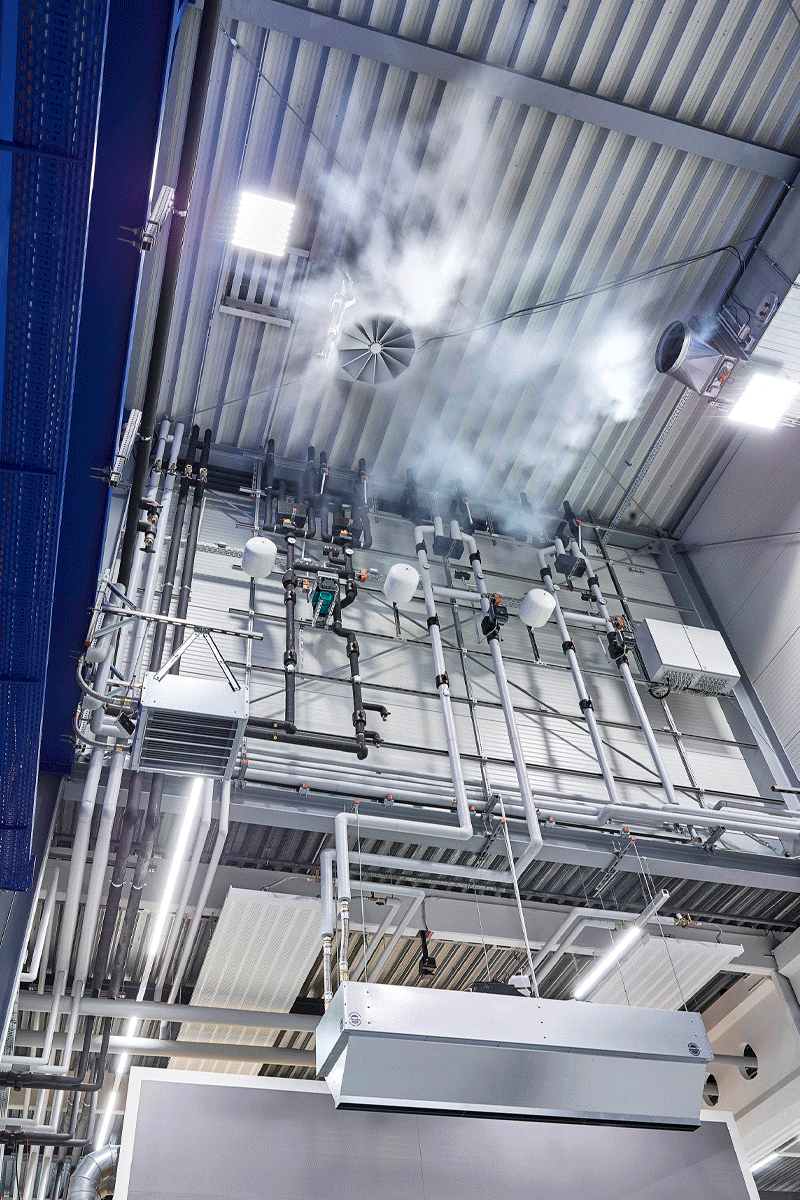 In Fabrik-, Montage- und Lagerhallen sind große Deckenhöhen Standard. Da kann man schon mal Zweifel haben, ob Lufterhitzer oder Luftdurchlass die entsprechende Eindringtiefe haben, um die Luft bis zum Boden zu transportieren. Kampmann stellt den Impuls seiner Geräte im Industrieturm unter Beweis: Je nach Einstellung erreicht warme Luft spielend den Boden und kalte Luft verteilt sich gleichmäßig unter der Decke, um dann sachte und zugfrei herabzufallen.